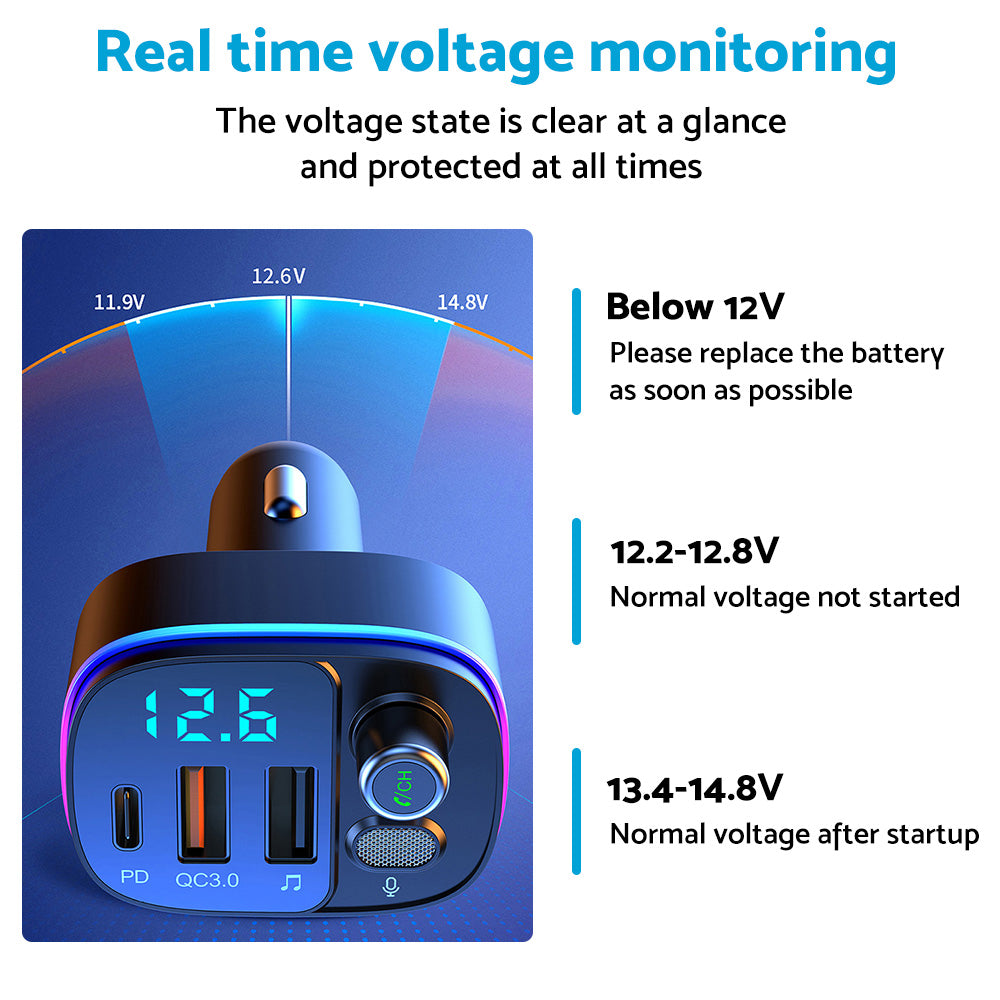 QC3.0 Quick Charge & 3 USB Ports: Charge 3 devices simultaneously with this Bluetooth-compatible FM transmitter car adapter. And the other USB charging port (5V/1A) also functions as a U disk port, the another is PD Type-C chaarging port. Built-in over-current protection, over-voltage protection, intelligent temperature control, short circuit protection, it will effectively ensure safe charging.