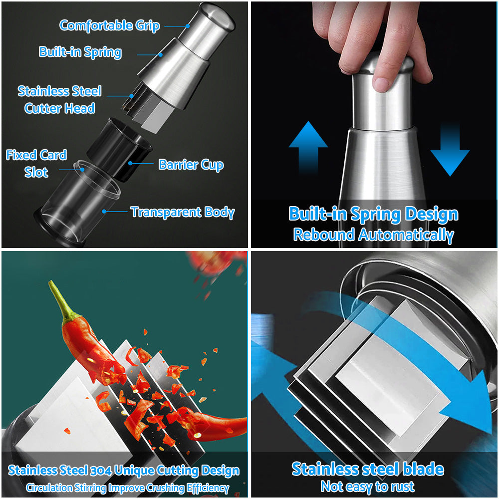 【High Quality Materials】The hand pressed stainless steel kitchen crusher is made of high-quality PP and stainless steel materials, which is not easy to rust, impact resistant, wear-resistant and durable.
